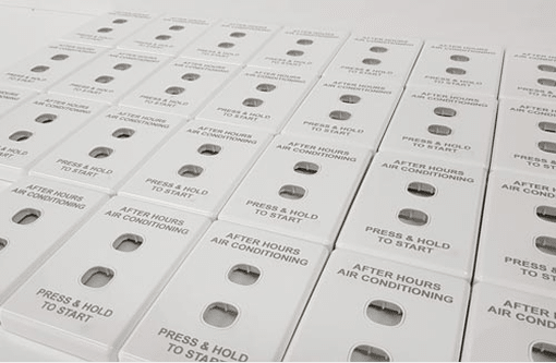 Durable Trotec 2-ply plastic labels used across electrical, HVAC, and solar sectors. Available in custom sizes up to 750×450mm, multiple colours, with optional 3M adhesive backing.